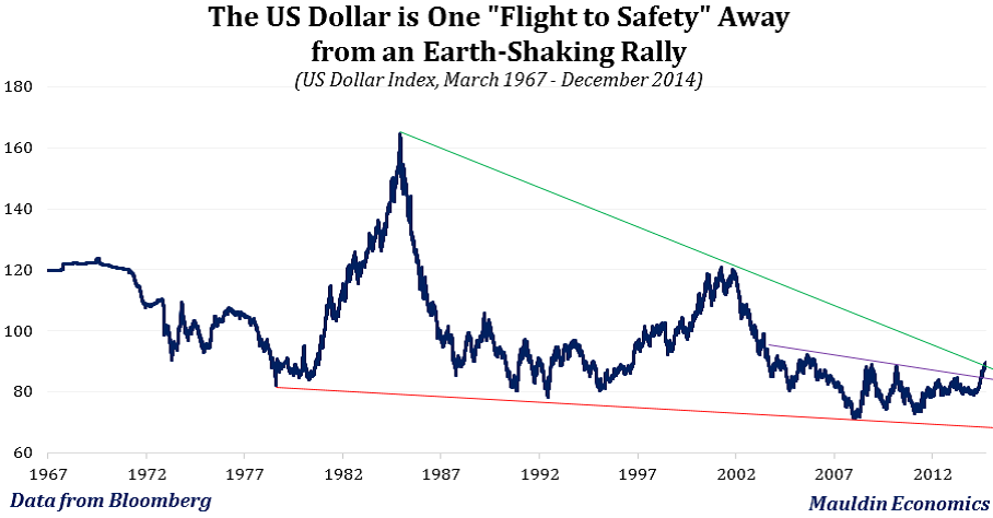 Last year saw two very shocking financial events. One was the abrupt decline in oil (see my 21 January 2015 post). The second was the steady rise in the U.S. Dollar. For the first time in 25 years, the dollar gained against all 31 of the world’s major currencies, according to John Mauldin in his Thoughts from the Frontline newsletter, January 5, 2015 edition.
