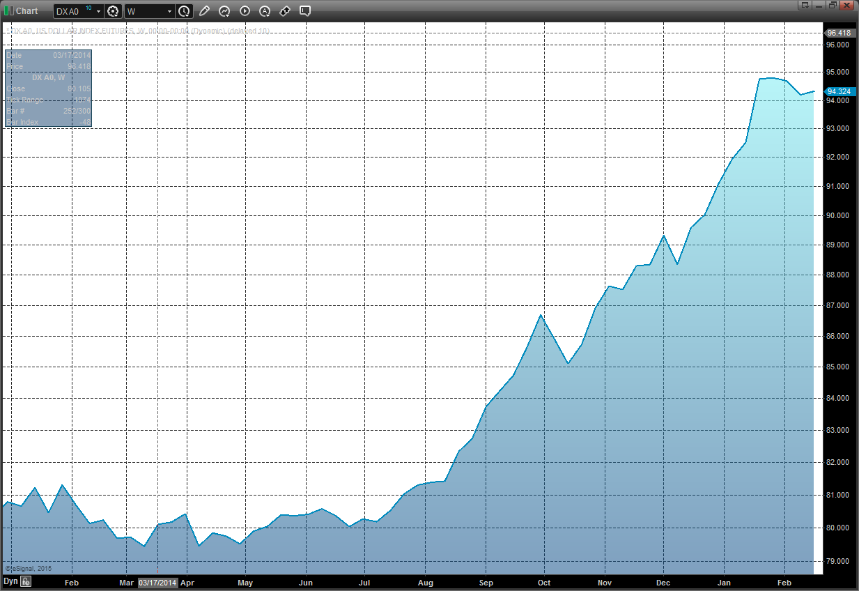 As you can see from the chart below, the dollar is up about 17% since January 2014.