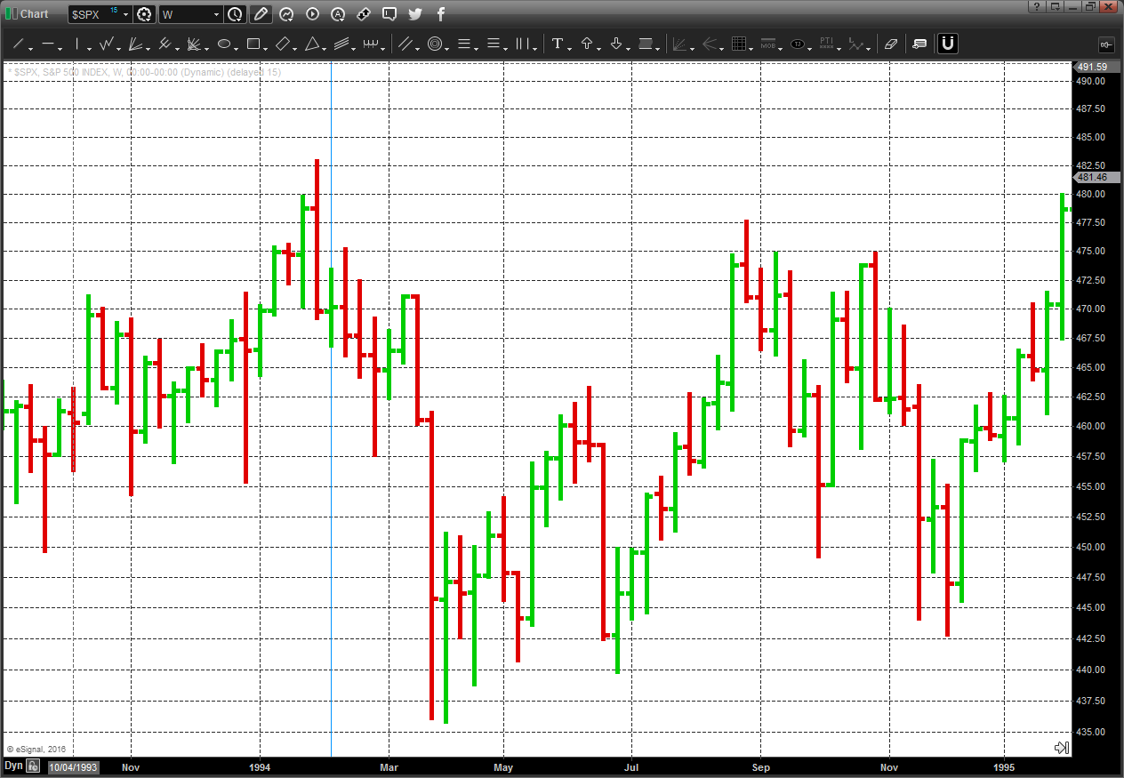 The final chart shows the Fed raising rates beginning in February 1994. Here again, the market suffered an immediate pullback (-10%), but regained it’s footing in April, and was up a year later.